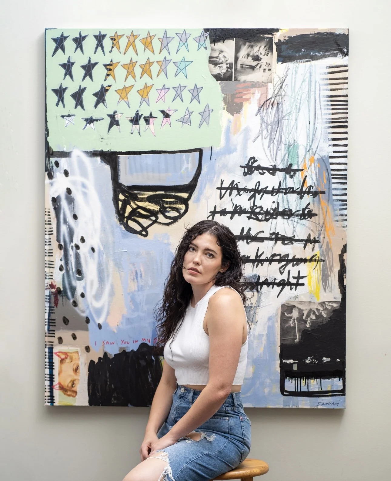 Working with bold color, collage, heavy texture, and recurring patterns, she builds layered, visual worlds that invite viewers to pause, look closer, and consider the visual conversation unfolding within each piece.